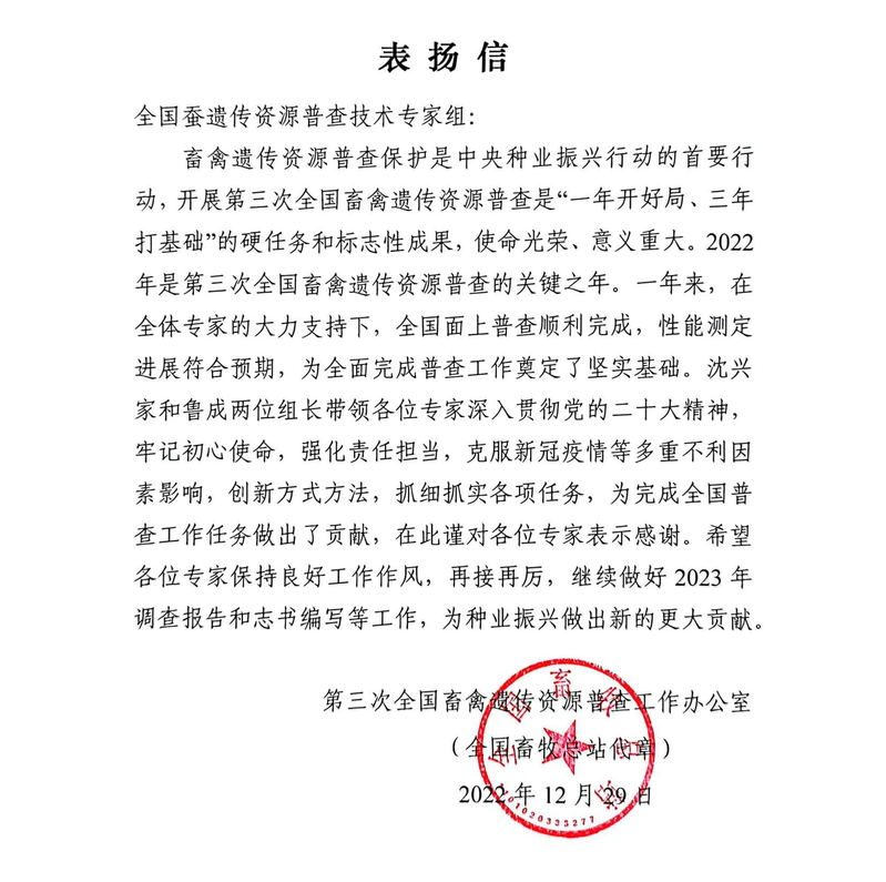 近日,新蒲京官网全国蚕遗传资源普查技术专家组收到来自第三次全国畜禽遗传资源普查工作办公室的表扬信,信中对专家组成员一年来为完成全国普查工作任务做出的贡献表示感谢,同时希望各位专家保持良好工作作风,再接再厉,继续做好2023年调查报告和志书编写等工作。