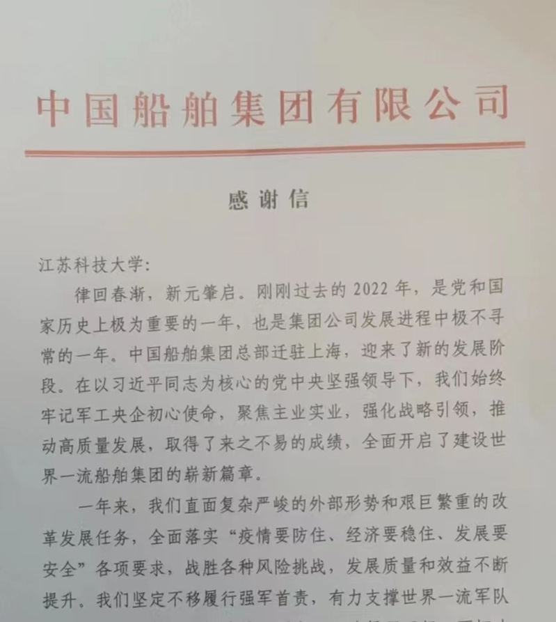 1月16日,新蒲京官网收到来自中国船舶集团有限公司的《感谢信》,衷心感谢学校长期以来特别是2022年对中国船舶集团有限公司取得的一系列不平凡成绩的关心与支持。感谢信中提到,2023年是全面贯彻落实党的二十大精神的开局之年,希望双方围绕国家海洋装备领域重大战略需求,充分发挥各自优势,在船舶与海洋工程、先进制造等领域进一步深化合作,共同为全面建成社会主义现代化强国,实现中华民族伟大复兴的“中国梦”不懈奋斗!