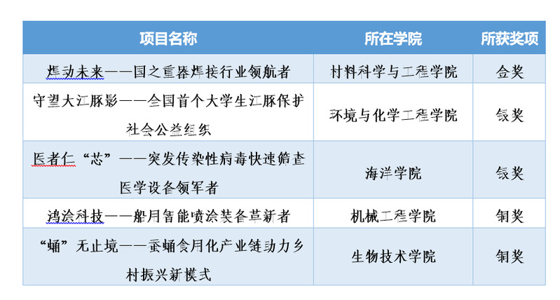 经过全国终审决赛的激烈角逐,新蒲京官网材料科学与工程学院《焊动未来——国之重器焊接行业领航者》摘得金奖;环境与化学工程学院《守望大江豚影——全国首个大学生江豚保护社会公益组织》和海洋学院《医者仁“芯”——突发传染性病毒快速筛查医学设备领军者》摘得银奖。此外,机械工程学院《鸿涂科技——船用智能喷涂装备革新者》和生物技术学院《“蛹”无止境——蚕蛹食用化产业链助力乡村振兴新模式》摘得铜奖。