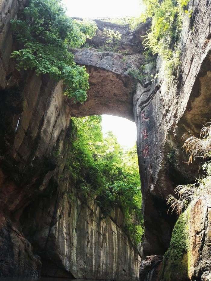 最著名胜景的是“天雨汇胭脂,奇妙天生桥”。明朝年间组织数十万民工,耗时十年多,焚石凿河十五华里,上接石臼湖,下连秦淮河。两岸山岗岩石夹杂着紫红,犹如胭脂,故名“胭脂河”。“以巨石面留为桥,中凿石孔十余丈,以通舟楫,桥因势而成。”得“天生”之名。乘船进入胭脂河,只见两岸怪石高悬,绝壁危岩,一条巨石横跨两岸,十分壮观。石桥横跨两岸,构成“长虹卧波”天然美景,天生桥因河两岸险峻、陡峭、秀丽、幽深,素有“江南小三峡”之称。“天雨汇集胭脂河,鬼斧神工天生桥!”果真名不虚传。