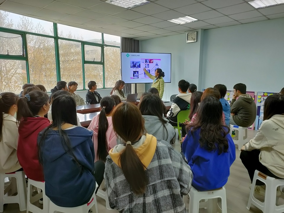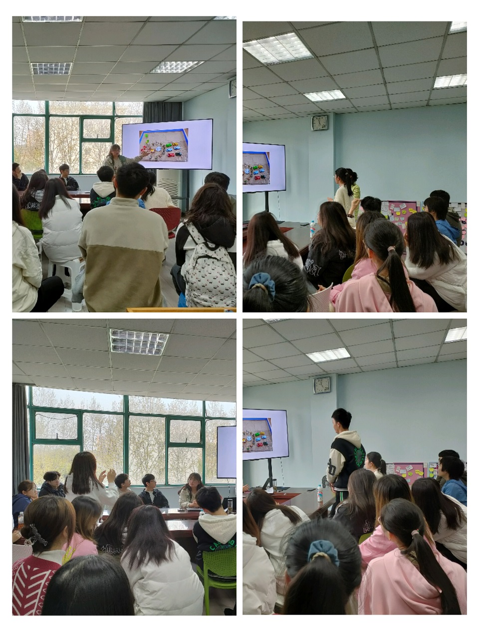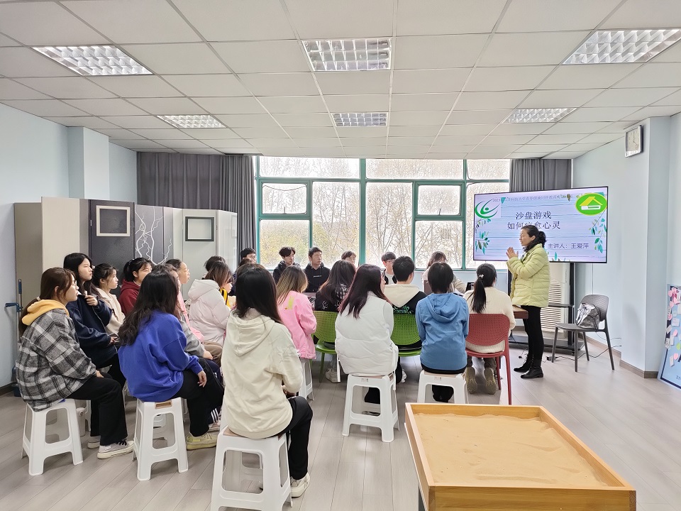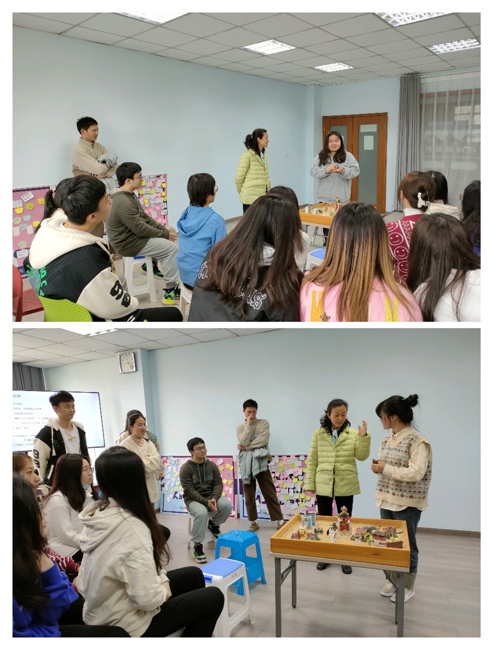 王爱萍老师首先指导学生自主选择沙具并摆放在沙盘里,通过动手实践,让学生初步体验了解什么是沙盘;然后带领学生观看沙盘测验综艺视频及自己拍摄的演示讲解微视频,现场邀请几位学生分享摆放的沙具,并逐一给予了心理解析,进一步帮助学生了解沙盘游戏的操作方法和作用;接着深入浅出地讲授了沙盘游戏的相关理论知识,如沙盘游戏的传播与发展、分类、治愈过程原理、涉及到的相关心理学知识等,指导学生理论联系实际,全方位去认识沙盘游戏,掌握沙盘游戏为什么能治愈心灵以及是如何治愈心灵的;最后,王老师以沙盘案例为辅助,邀请现场学生交流互动、开展练习,传授心理分析技巧,指导学生帮助来访者了解和发现自我,在沙盘游戏中获得心灵的释放。
