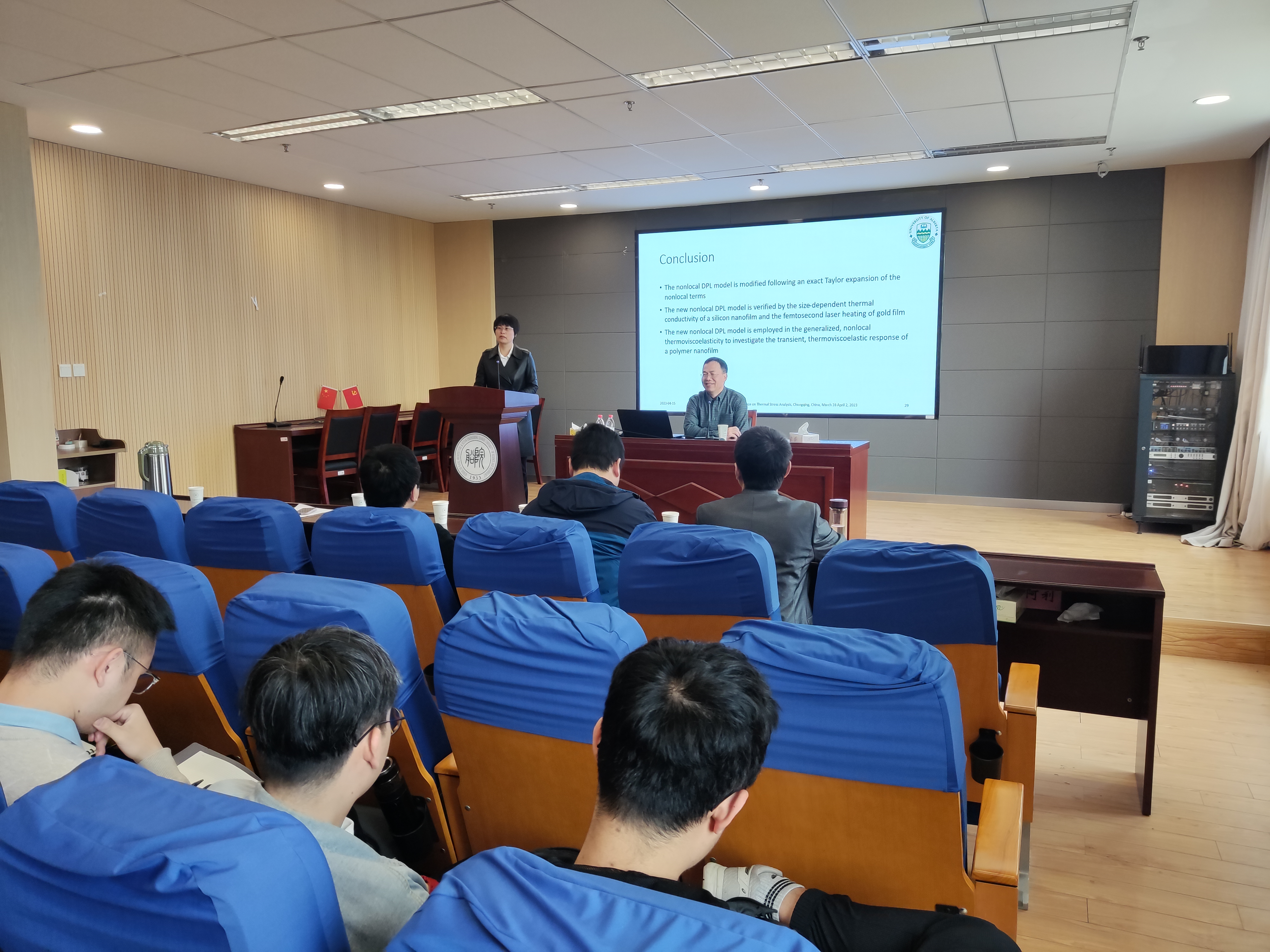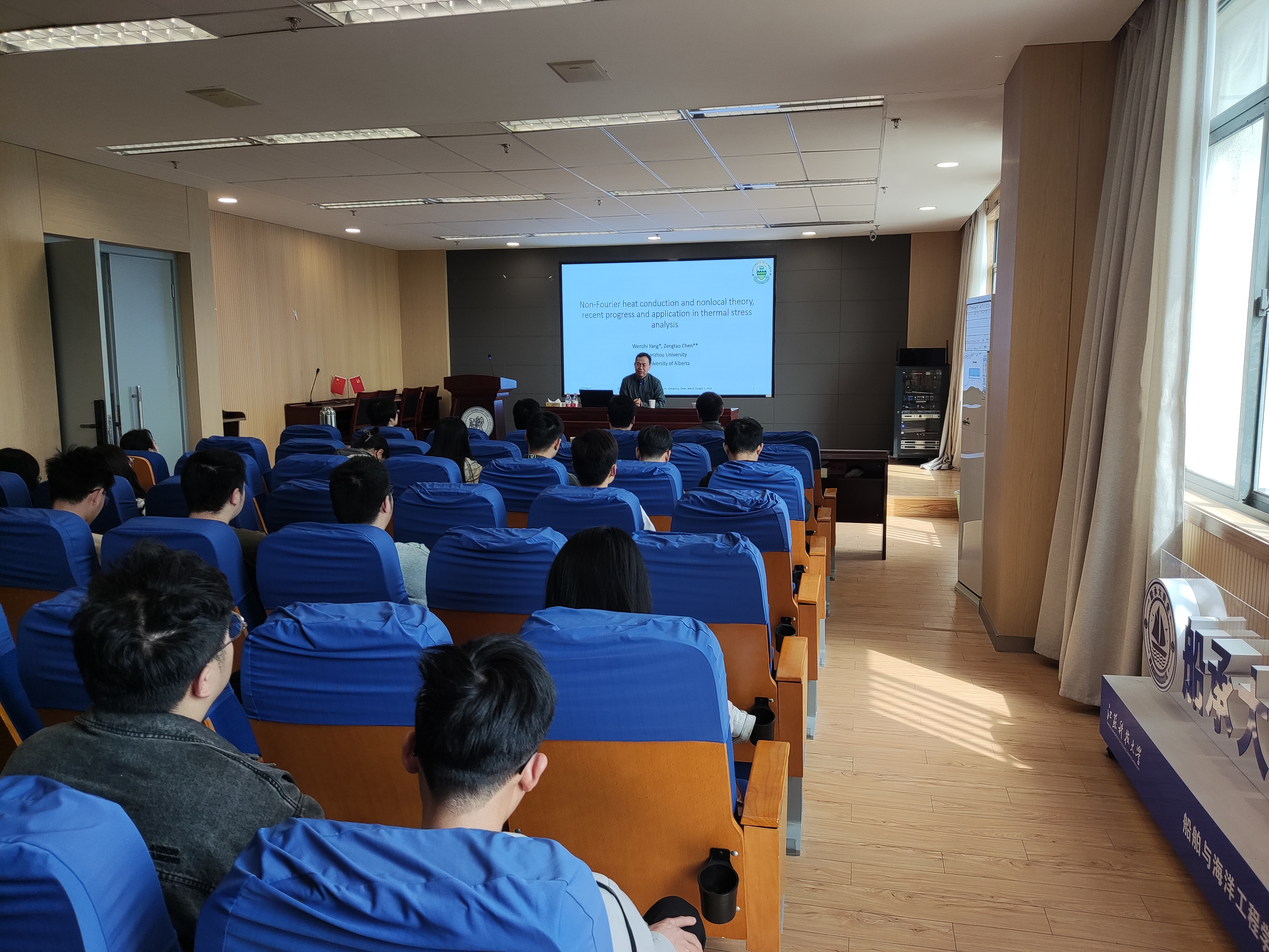 在学术报告中,陈增涛教授讲解了热应力分析的背景、应用,以及团队在非傅里叶非局部热传导理论的最新研究成果。他从非傅里叶热传导理论的应用,讲到非局部理论的提出、研究方法、实验对比、工程应用等,既介绍了科技前沿技术,又为船海学院工程力学系师生的研究内容、研究方向给予了针对性指导。