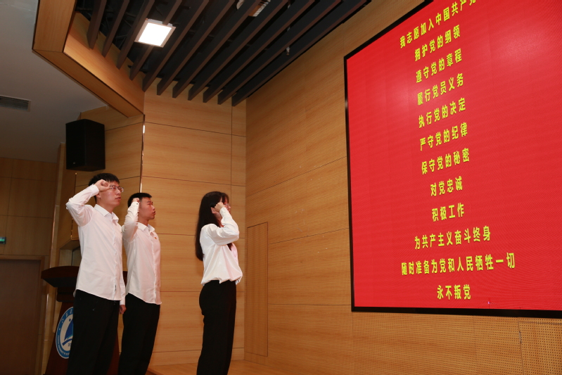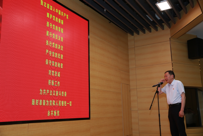 校党委副书记汤建带领全体党员重温入党誓词。党员同志面向党旗庄严宣誓,在铮铮誓言中重温入党初心,坚定理想信念,牢记责任。
