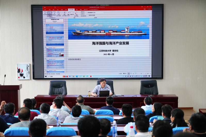 6月25日下午,校党委书记葛世伦教授为新蒲京官网举办的中国船舶集团有限公司第五期中层干部工商管理培训班作“海洋强国与海洋产业发展”专题报告。来自中国船舶集团53家成员单位的80名学员,以及学校党办、科研院、人文社科处、经济管理学院的部分中层干部和教师聆听了授课。