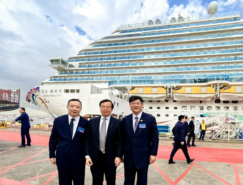 周南平书记与上海外高桥造船有限公司党委书记、董事长王琦(右一),上海外高桥造船有限公司总经理、大型邮轮总设计师陈刚(左一)在“爱达·魔都号”前合影