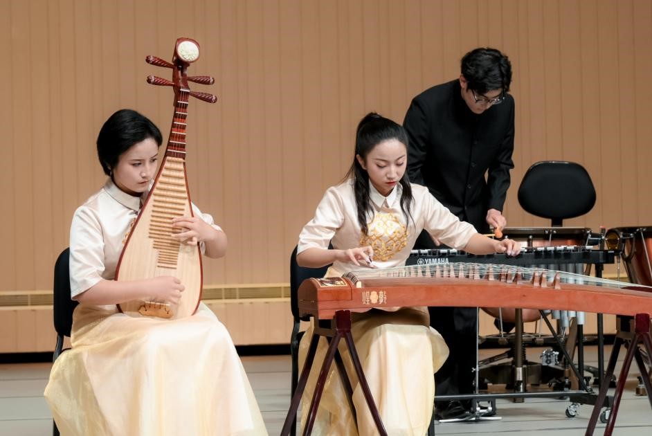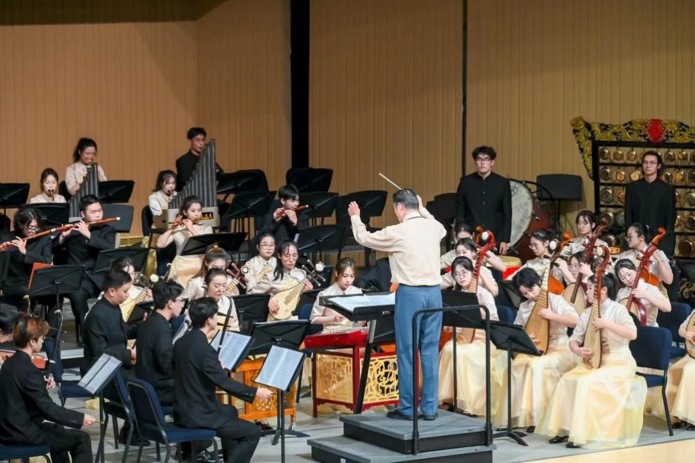 《凤鸣朝阳》(新版)由作曲家张志强受学校委约创作。该曲取材于江苏丹阳地方戏曲音乐,突出多种中国传统乐器丰富的演奏技法和声音效果,采用复调和戏曲音乐紧打慢唱等创作手法,辅以民族和声以及转调,让作品在传统的基础上立体而新颖,从而使作品内涵更加形象生动。寓意在新时代新征程中,莘莘学子如凤凰一般向着朝阳,静心刻苦钻研、不畏艰难、展翅高飞、奋勇拼搏,在新时代发展的洪流中面向光明未来再蓄势待发。
